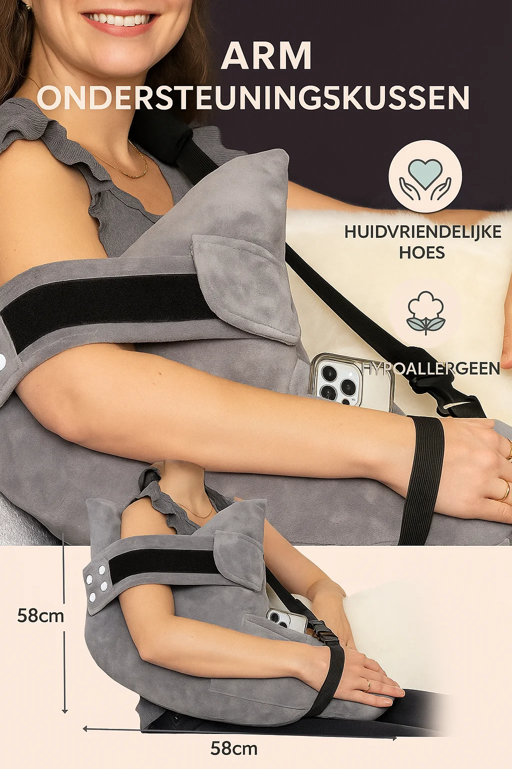 Gerichte ondersteuning voor de arm – biedt stabiliteit en comfort bij rust of lichte beweging.