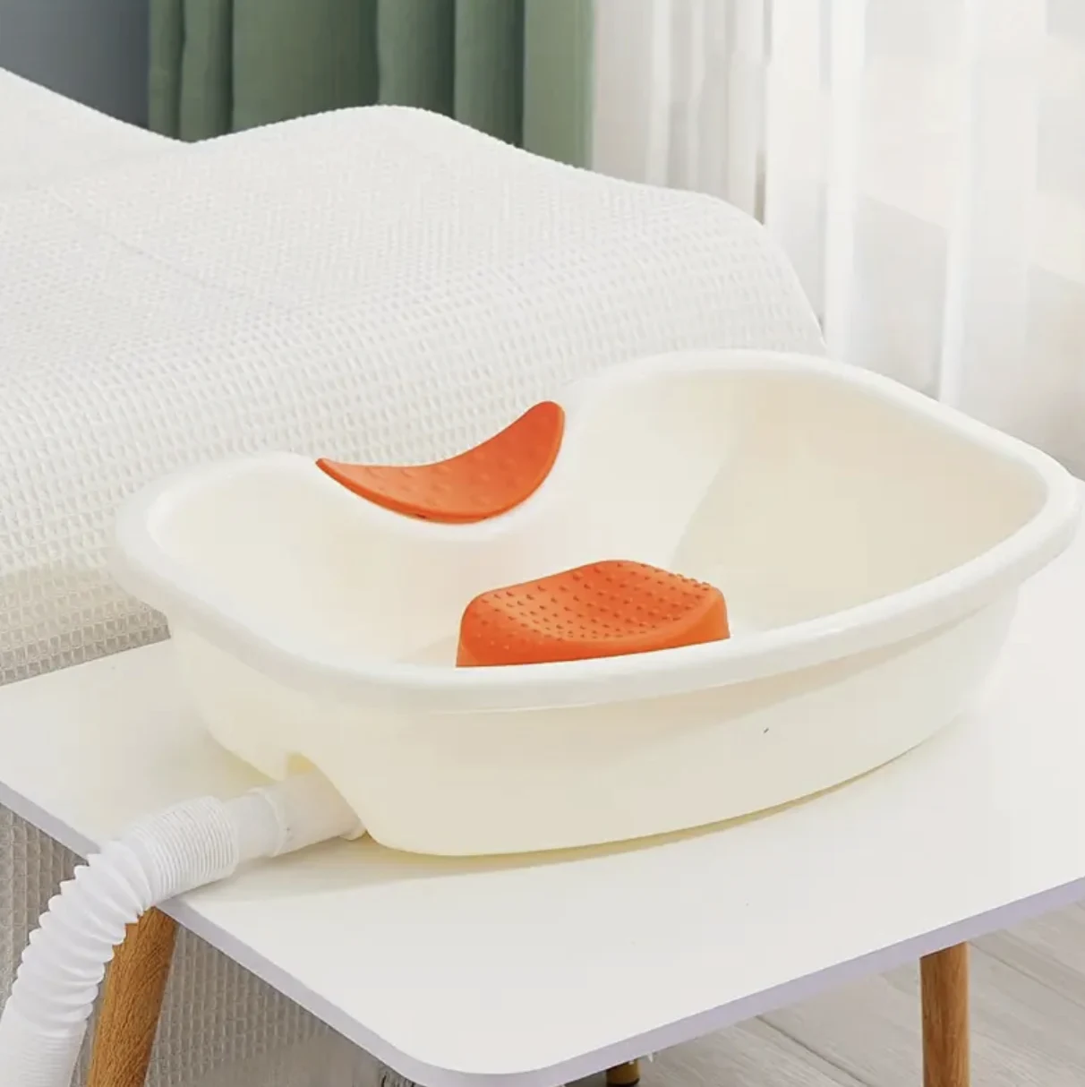 Dit bedbad met neksteun is speciaal ontworpen om comfortabel en eenvoudig haar te kunnen wassen terwijl je in bed ligt. Dankzij de zachte vorm met neksteun en een ingebouwde afvoerbuis kan water gemakkelijk worden afgevoerd, waardoor knoeien wordt voorkomen. Het is ideaal voor gebruik thuis of onderweg en kan helpen bij persoonlijke verzorging zonder dat je naar de badkamer hoeft te verplaatsen.