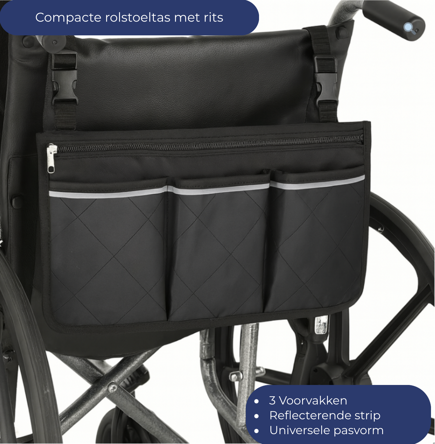 📦 Compacte Rolstoeltas met Rits – Zijtas met 3 Vakken en Reflecterende Strip