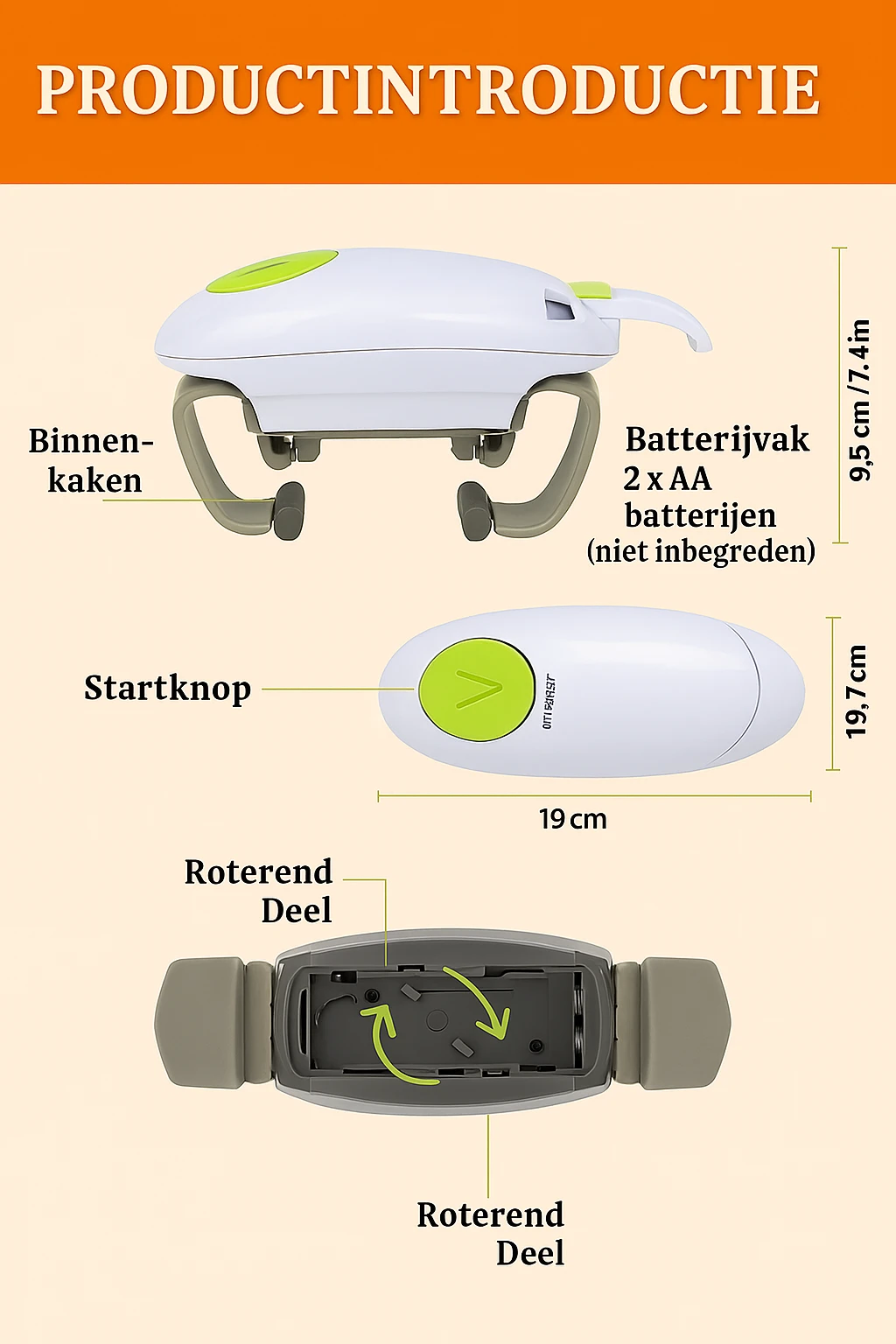 De opener werkt op 2× AA-batterijen (niet inbegrepen).
