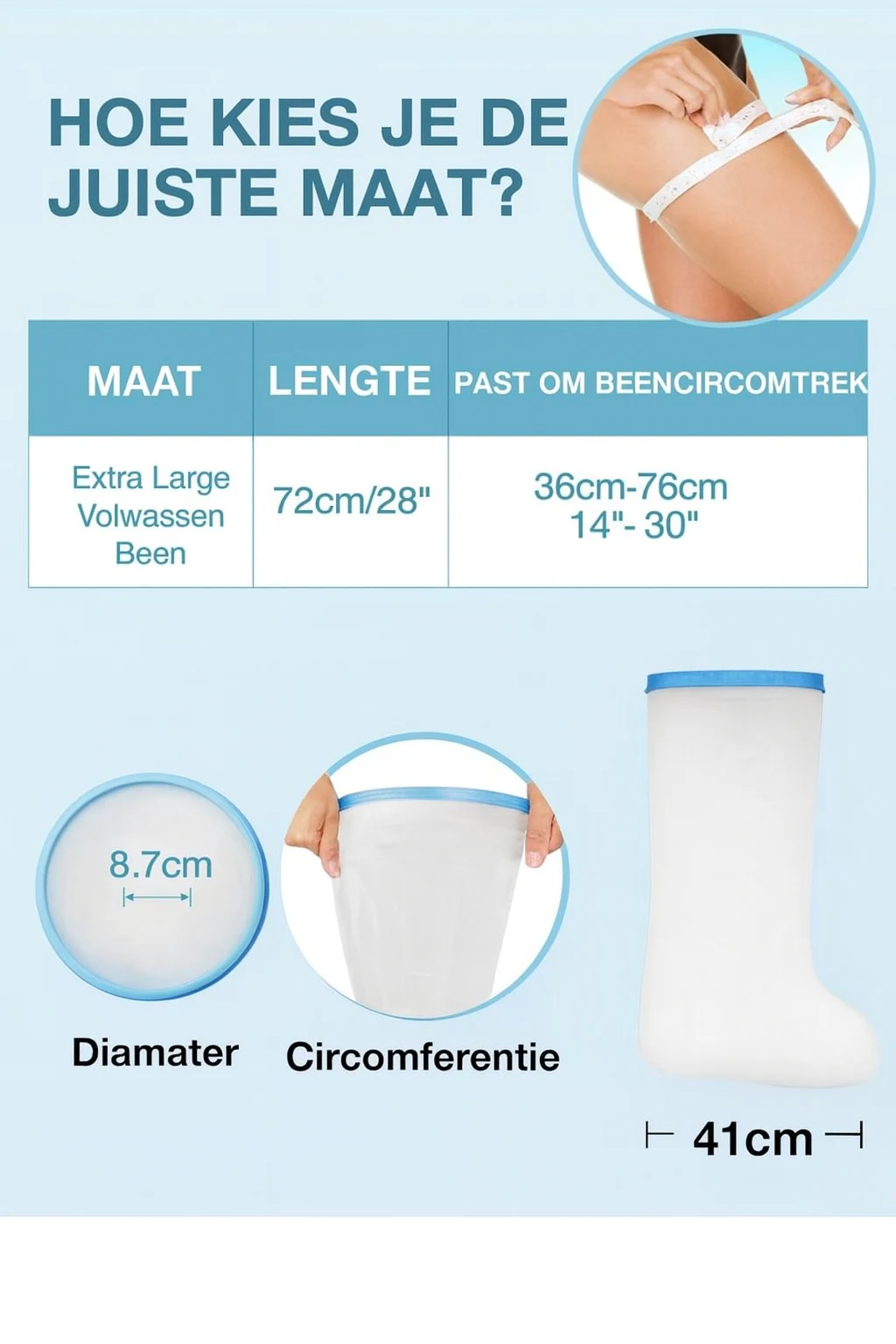 Blijf zorgeloos douchen of baden met deze herbruikbare waterdichte beenhoes. De zachte siliconen afsluiting en het elastische materiaal zorgen ervoor dat de hoes goed aansluit en droog blijft. Het ruime XL-formaat is geschikt voor verschillende beenmaten en daardoor ideaal voor dagelijks gebruik.
