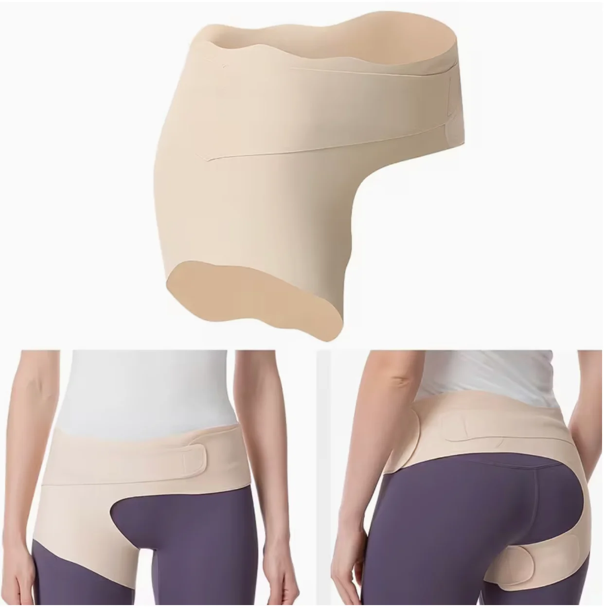 De brace geeft gerichte druk rondom de heup en het bovenbeen, wat helpt bij het verminderen van belasting en het ondersteunen van de spieren tijdens beweging.